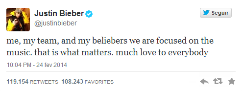 “Eu, minha equipe e minhas Beliebers estamos focados na música. É isso o que importa. Muito amor a todos”