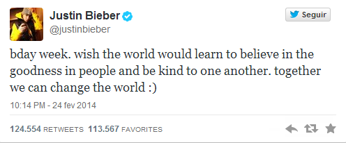 “Semana de aniversário. Quem dera o mundo aprendesse a acreditar na bondade das pessoas e a ser gentil um com o outro. Juntos podemos mudar o mundo :)”